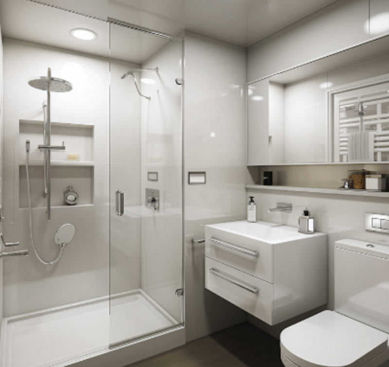 Modern walk-in showers, soaking tubs, and combination units with premium fixtures.